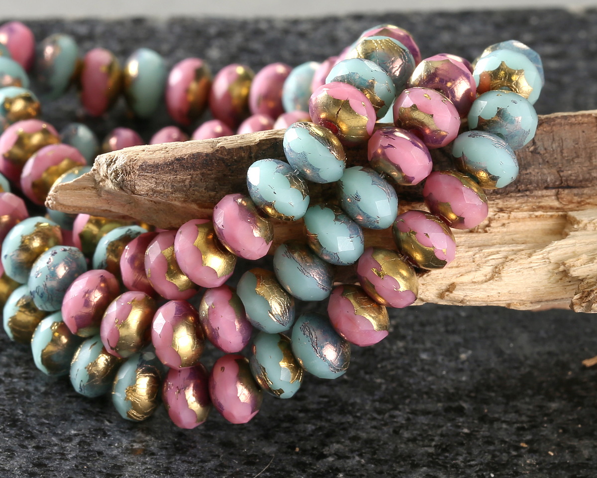 Czech glass fire polished rondelles in desert rose & sky blue mix with gold and bronze finish. A vintage-inspired blend of color that will look great in so many jewelry designs! Add interest to petite bracelets, seasonal anklets, and floral earring styles.