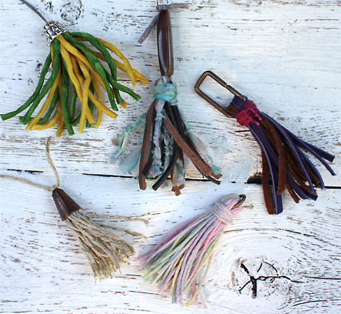 I have been seeing tassels everywhere in jewelry, from the runways to fashion magazines to shops around town. Tassels are a really easy embellishment to add to a grouping for a necklace focal or even as a charm off a bracelet. There are tons of possibilities and making them is super easy! All you need are 3 things for your basic fiber tassel - cord, adhesive and scissors/shears. (we have pre-made chain tassels in popular metal finishes)