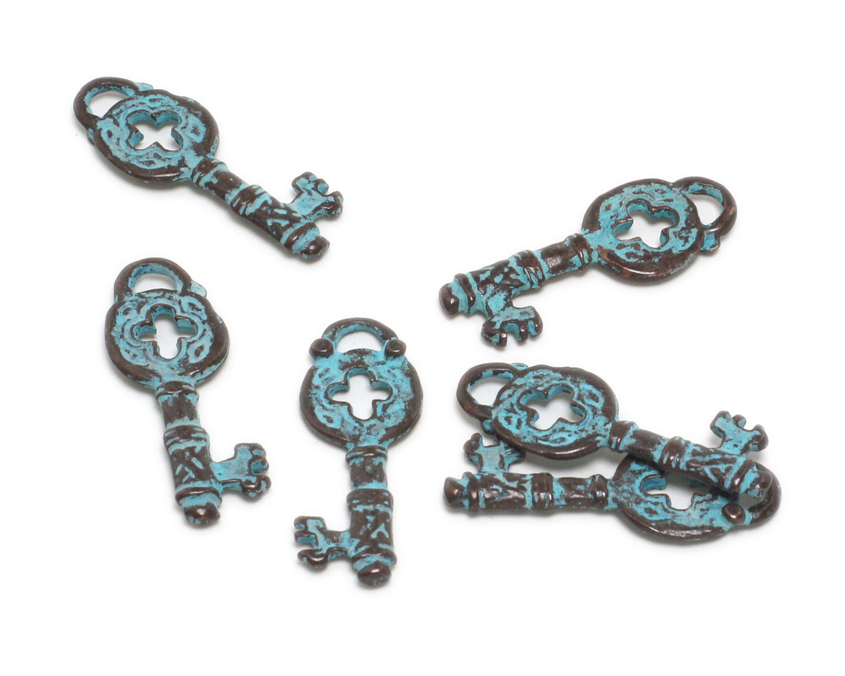 Unlock your creativity with this beautifully crafted Mykonos copper key charm. Sized just right, it brings a rustic feel to your projects with its patina finish. They fit perfectly with an antique or vintage theme.