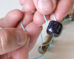 Now that the guru bead is strung, finish your necklace. A thread burner can seal the ends of nylon cord, and a dap of adhesive on the knot will keep it strong.