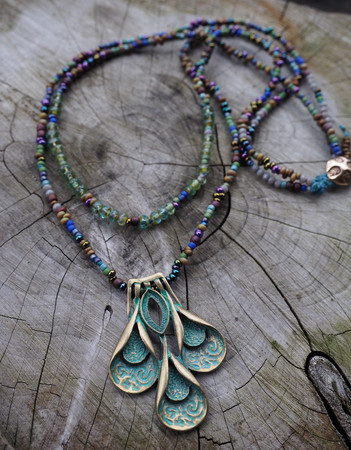 This Art Nouveau focal is reminiscent of the beautiful paintings and stain glass art of the period featuring mossy greens, bronzy metallics, iris blues, and lavenders.