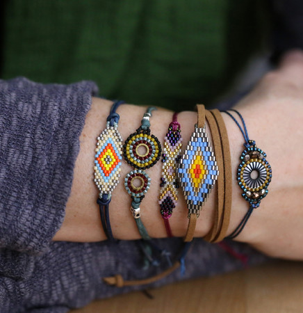 Make on-trend bracelets in under 10 minutes! Simply pick out a cool woven focal link and attach your choice of stringing material. I opted for 1.5mm leather cord, c-lon TEX, silk string, and 3mm microsuede. Attach using simple knots and either a sliding knot closure or a sliding bead for closure :)