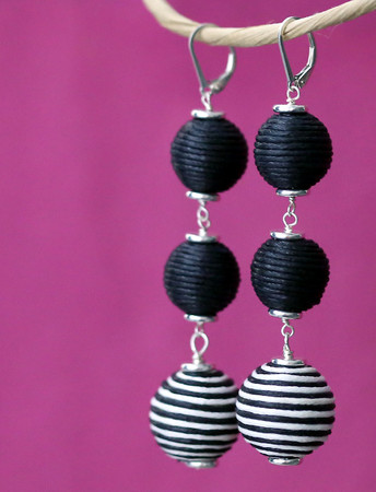 I like working from the bottom up on earrings. Start by stringing your headpin: bead cap - 18mm bead - bead cap. Then create a wire wrap loop. Try to keep the loop snug to your bead cap, this will secure the placement of the caps against the bead so they don't shift around too much. You could also try dabbing a touch of adhesive onto the underside of the caps, prior to placing against the thread-wrapped bead. Finish your earring design by creating and linking together 2 wire wrapped links using the same bead caps, but with the 14mm beads. Don't forget to loop the first one onto your larger thread bead charm!