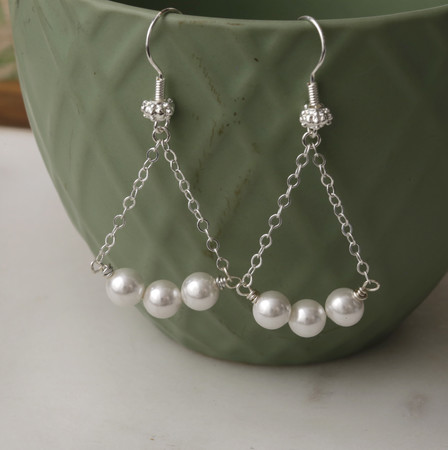 These earrings have an unexpected swag shape and dangle at just the right length. I used shell pearls for a classic look. These would be perfect for your wedding day or any evening event.