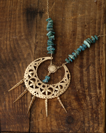 Chrysocolla chips accentuate the gold focals on this statement necklace.