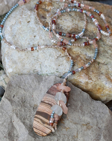 Blue slate, rainbow black diamond, rosaline, rainbow smoky topaz and silver lined crystal - These might not be colors you would immediately say yes to combining together, but I love when they are all together! I chose to knot these seed beads in frosted tones on natural color waxed cord, combined with a bit of African glass and a lovely sand colored matte thin sliced oval gemstone pendant.