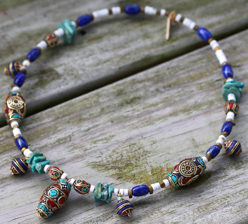 For this necklace, I decided to use Lapis, Chrysocolla, White Howlite, and gold accents to accenctuate these great Tibetan focal beads.