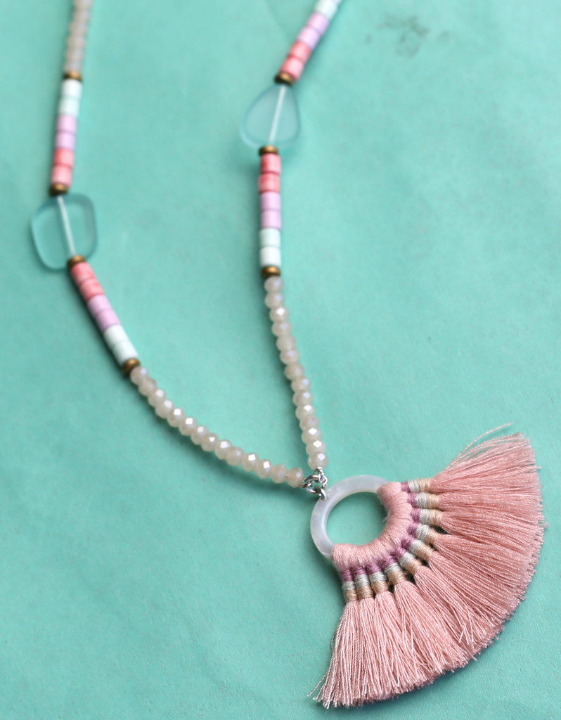 Make any necklace instantly stand out by adding these great fanned tassel focals! I think the tassels look the best on a longer necklace- for this one I strung crystal rondelles, agate tubes & recycled glass on wire & added length with the Chinese knotting cord. You can also use C-Lon cord instead of the wire.