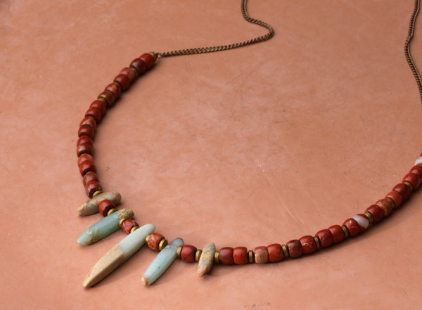 Using the wire, slide on approx. 16 red bend jasper rondelles (separate every two beads with a rondelle), 5 impression jasper sticks (each separated with a red bend jasper rondelle & two gold rondelles), and then 16 more red bend jasper rondelles, with a gold rondelle every two beads. Attach the wire to your desired length of chain with a crimp tube.