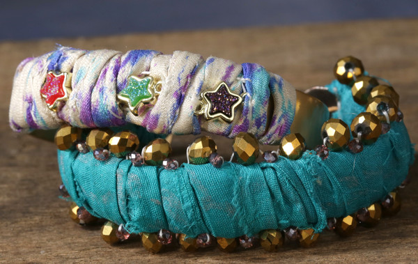 For the bracelet with the druzy stars, I wrapped the sari around the cuff, knotted the ends, placed a drop of glue on the knot, and tucked the knot under the overlapping pieces of sari.