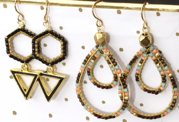 For the triangle earrings, I wrapped the charm around the bottom of the hexagon focal with wire. I made a loop with the wire at the top as well, and attached to the earwire. For the drop earring, I used wire to wrap the smaller drop inside the larger one. At the top, I made a bead link and attached to the earwire.