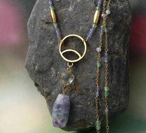 For this design, I made a bead chain with Green Aventurine, Tanzanite, & Crystal. I then attached it to a new Nunn Design focal. To finish, I added a piece of Rainbow Fluorite & a Prasiolite link- I love how the Green Aventurine & Tanzanite really bring out the colors of the fluorite! This necklace would also look great with an amethyst slice as the focal.
