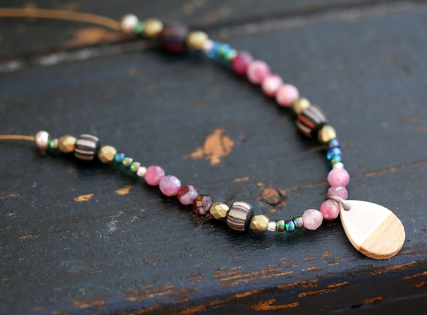 You will need 1 wood and resin teardrop, pink tourmaline faceted rounds, fire polished 4mm rounds, 11/0 seed beads, 8/0 seed beads, tuff cord #3, crimp beads and covers, (3) 6mm jump rings, and a lobster clasp. I listed other options for the African beads below.