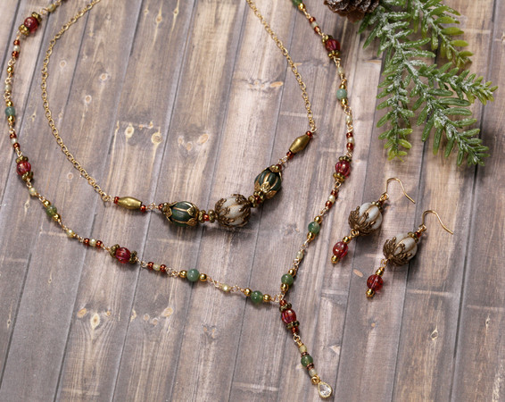 Inspired by the holidays, I used Czech glass melons, seed beads, gemstones, and gold accents to create this festive set!