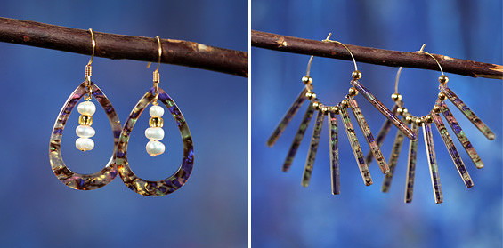 You will need 2 Abalone Acetate Teardrops and 14 Stick Drops, a pair of ear wires, a pair of hoops, freshwater pearls, 6/0 seed beads, head pins, and 16 gold round beads.
