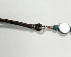 You will need 3 graduated paddle sets in antique silver, 1/2 strand of pacific blue apatite faceted 4mm rounds, 11/0 seed beads, antique silver eye pins, 3' of 2mm leather cord, 4 antique silver jump rings, silver wire, 2 stainless steel ribbon crimp ends, and a lobster clasp. Optional, if you like the look of the Chinese knotting or waxed linen cord wrapped around the leather cord you will need that as well.