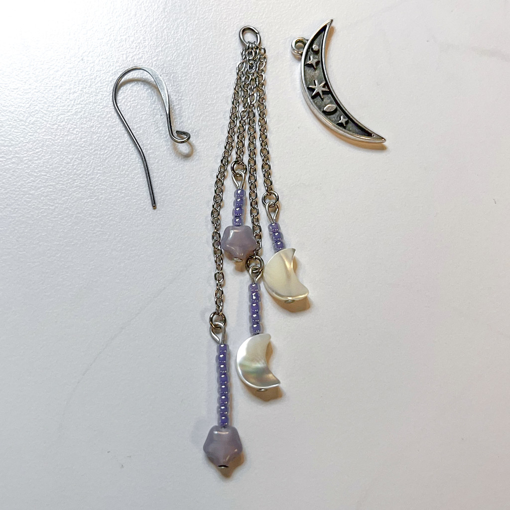 Slide the top of the chains onto the oval jump ring. Slide the oval jump ring onto the ear wire first, then the crescent moon.