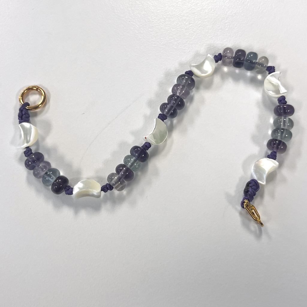 For the fluorite bracelet, cut 18" of cord. Watch the end of the video above to learn how to attach the lobster clasp. Image 1: The mother-of-pearl crescent beads have a smaller hole, so you will need to burn the cord a half inch in from the end until it gets heated and pull. Image 2: This will give you a narrow, pointed edge to the cord that will fit through the hole. String the beads in the order shown with your favorite style of knot in between.
