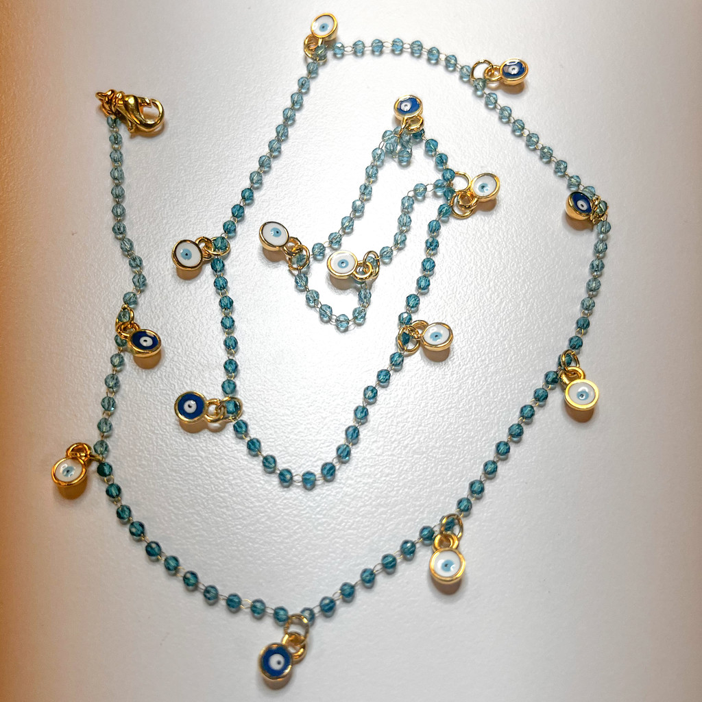 For the crystal chain bracelet, wrap the crystal chain around your wrist three times and cut. Attach the evil eye charms in a random pattern using jump rings. Attach your clasp with a jump ring.