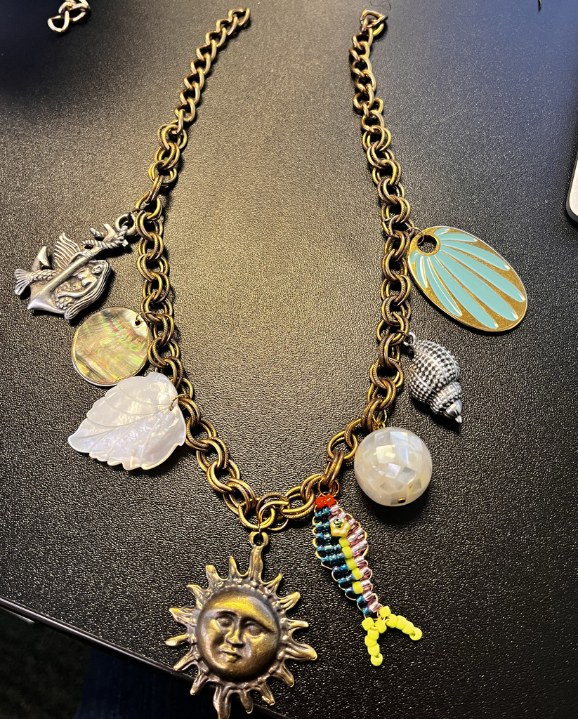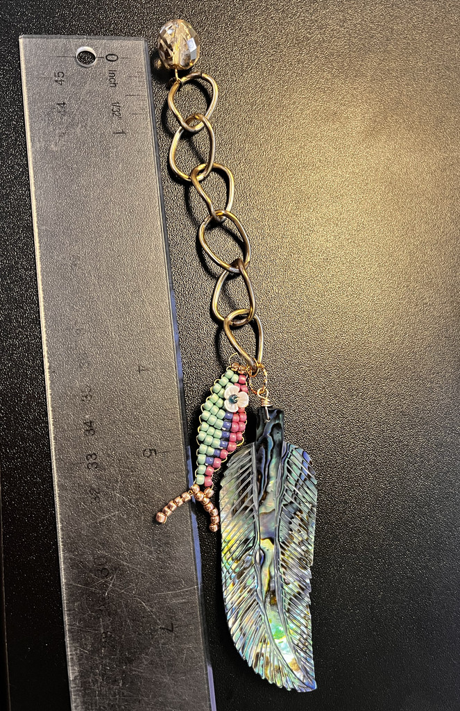 Slide both chain layers onto the carabiner clasps. Cut 4.5" of the x-large cable chain. Attach the abalone feather using a jump ring or wire-wrap a loop on. Attach the 14mm Czech glass gold round and another wire-wrapped fish. Slide this chain onto one carabiner clasp.