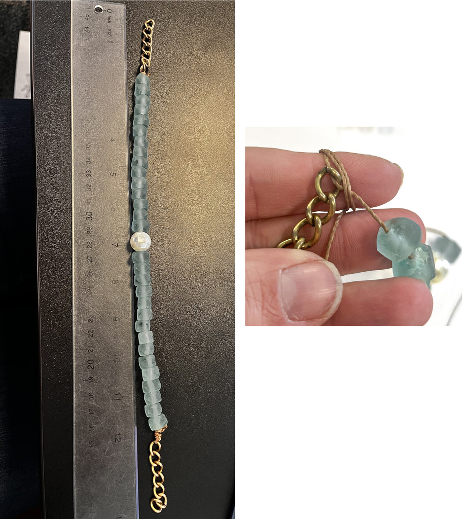 For the second (shorter layer), cut 16" of cord. Image 1: String the beads on in the order shown. Image 2: I cut 2" of curb chain to attach to each end of the cord. Take the cord and feed it through the curb chain. Bring it through and start to knot. I used a barrel knot and then wrapped it around one more time with 2 overhand knots. Cut any extra cord and lightly burn the knots to seal them using a lighter. Do the same to the other end.