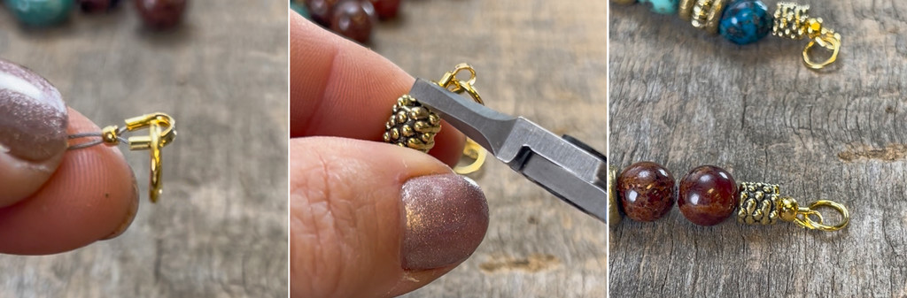 Image 1: Slide on a crimp tube, then a wire protector. Place the wire protector over the soldered jump ring and bring the cord back through the crimp tube. Use crimping pliers to crimp the tube. Feed some of the cord through a couple of beads, then trim. Use pliers to cinch in the wire protector. Image 2: Place the crimp cover over the crimp tube and close with pliers. Image 3: Crimp cover on.