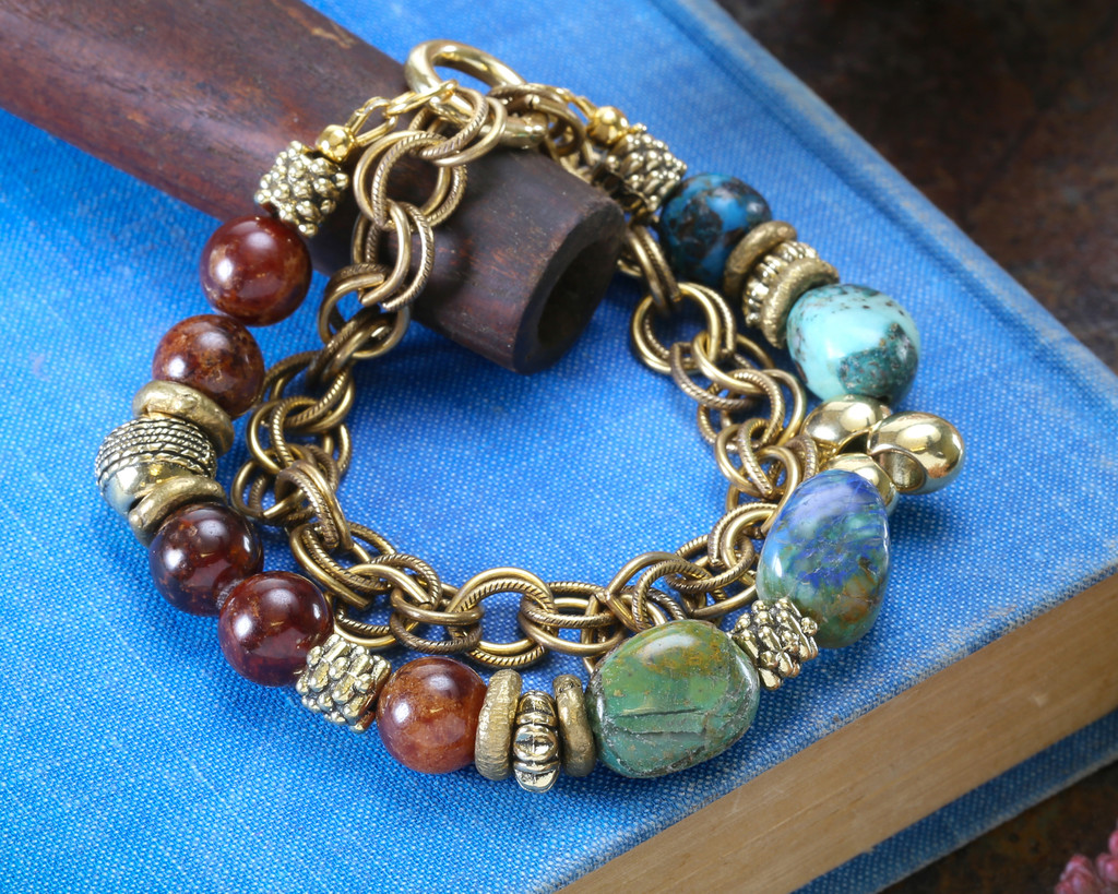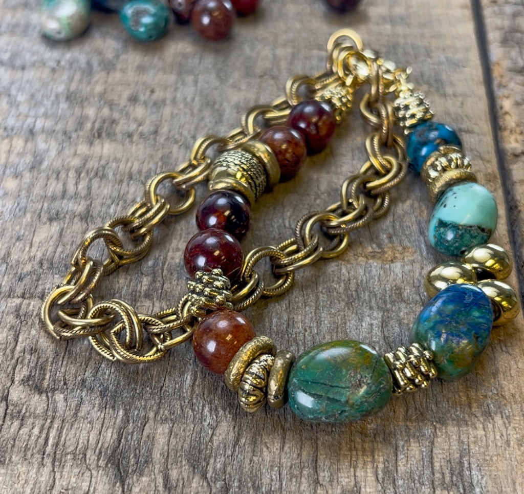 This luxe bracelet is full of rich colors with gold accents. Hessonite and Chrysocolla gemstones are the stars of this piece, they are a match made in heaven.