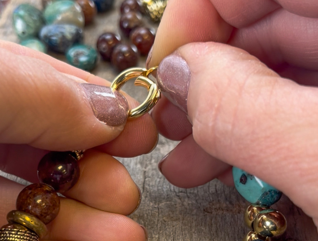 Attach the ring clasp to the jump rings. For the chain component: Cut the chain to fit your wrist. Slide the chain ends onto the ring clasp.