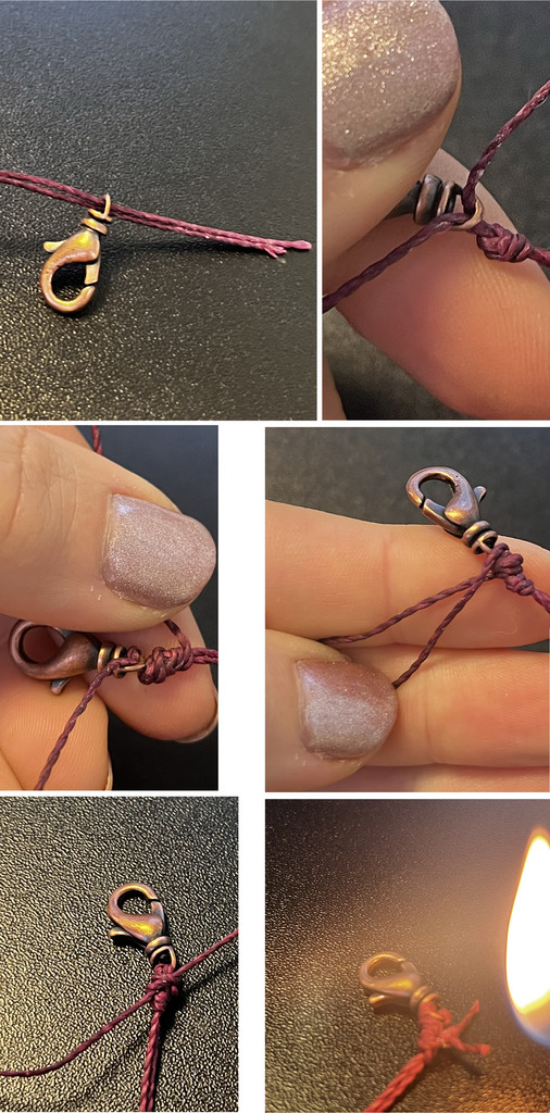 Image 1: Slide the lobster clasp onto both cords. Image 2: Separate the cords. Image 3: Wrap the right cord around several times. Image 4: Wrap the left cord around a few times in the opposite direction. Image 5: Tie two overhand knots. Image 6: Trim the cord and use a lighter to burn the ends to seal the knots. Follow the same steps for attaching the jump ring on the opposite end of the necklace.