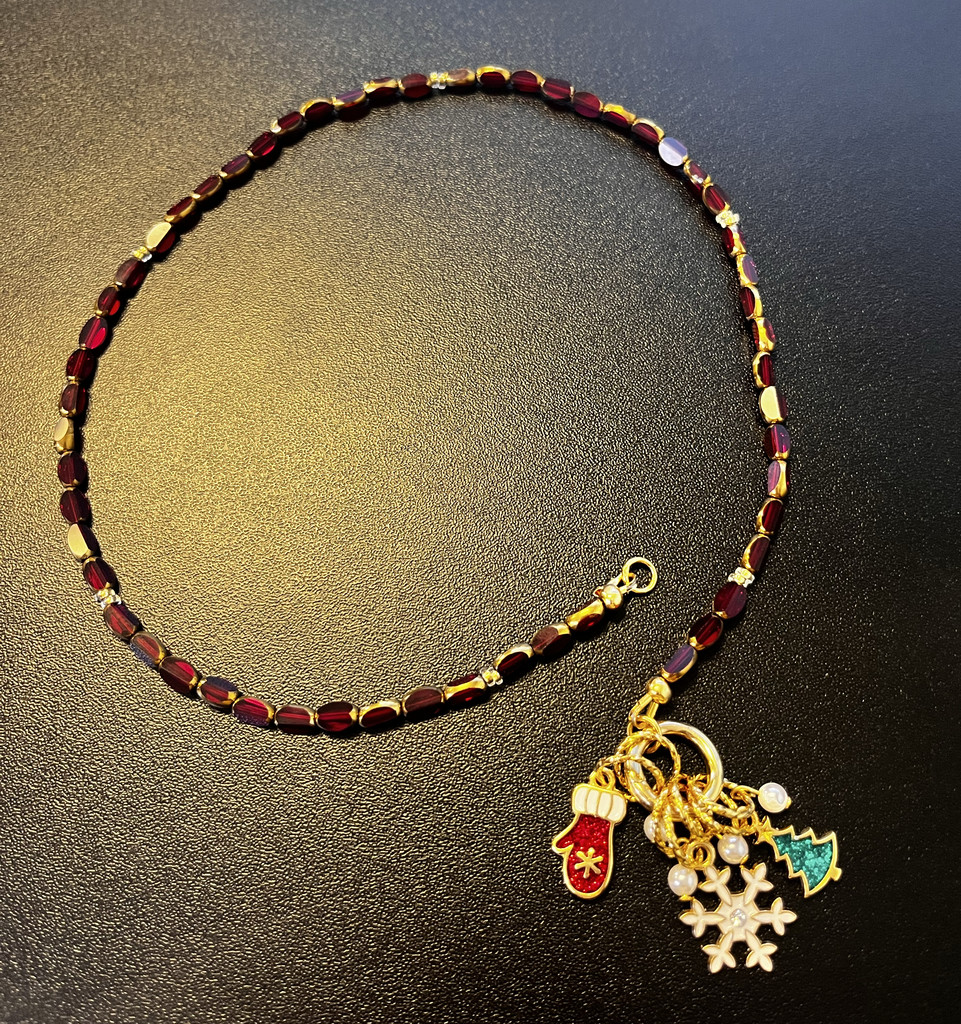 Deck your neck with this sparkling, festive necklace. You can add more holiday charms and even swap them out in the spring/summer to add some flower or fruit charms instead! The finished necklace is about 16.25" long.