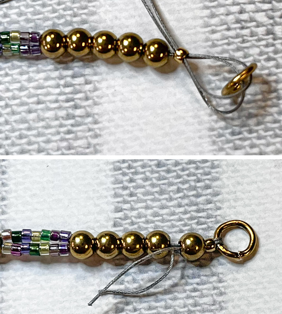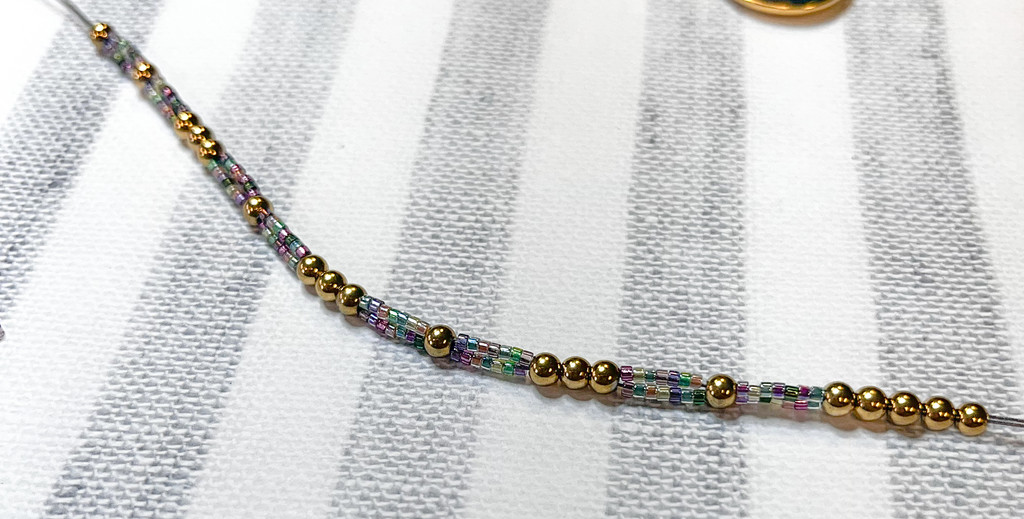 Cut two 11" pieces of cord. String both strands through the gold beads. Slide the seed beads onto each strand (7 per strand) in between the gold beads. Just keep checking to make sure the bracelet fits.