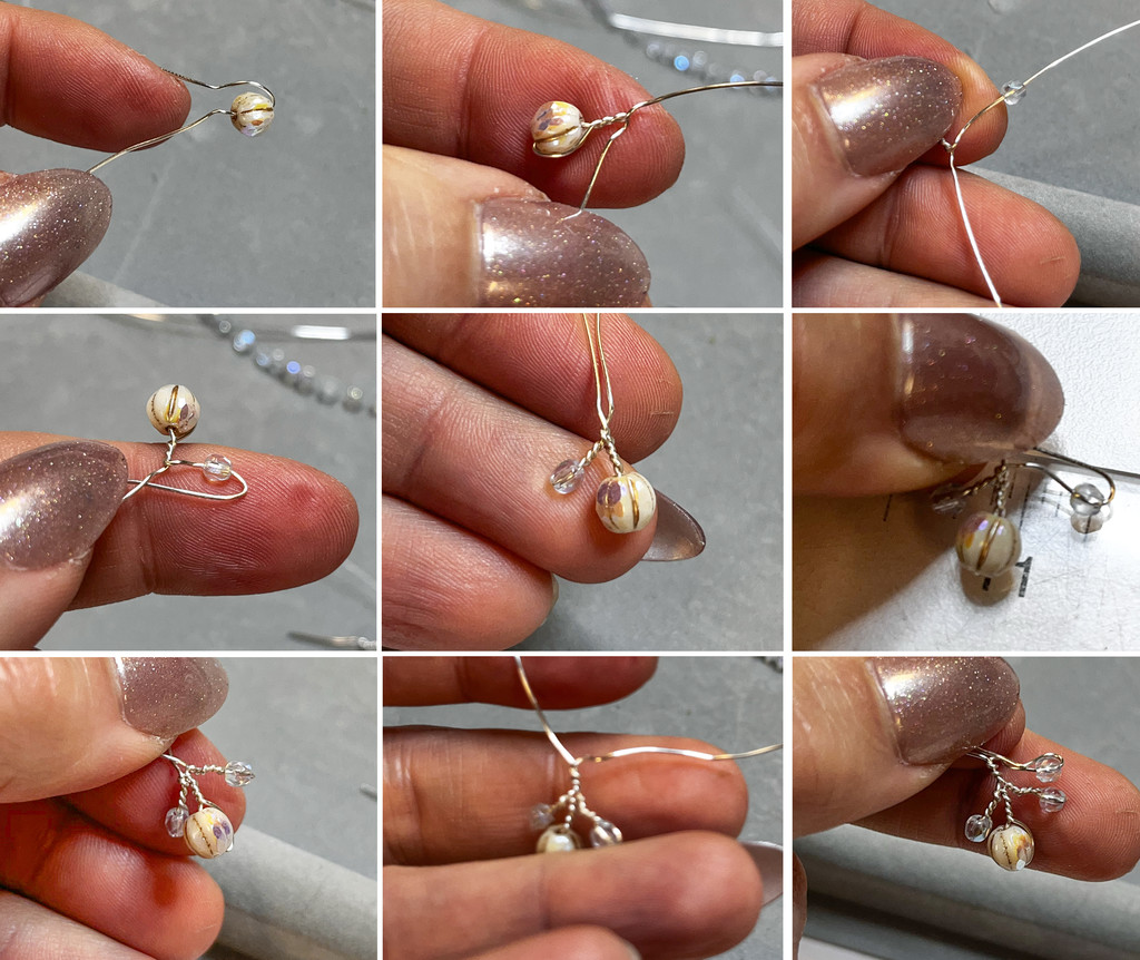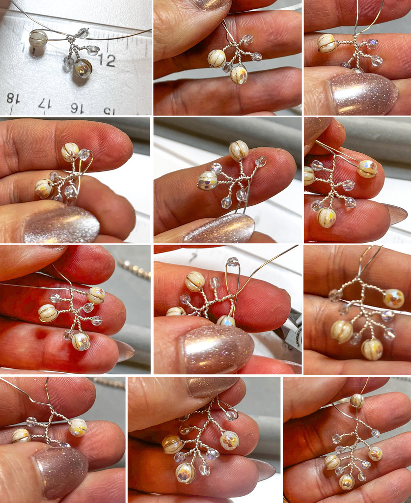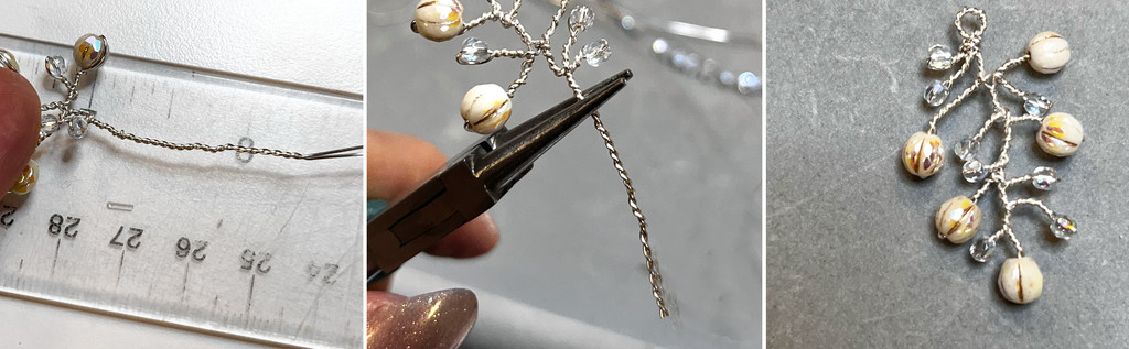 These images show the middle section of the branch. Continue sliding a bead on the wire, then twisting to form a branch.