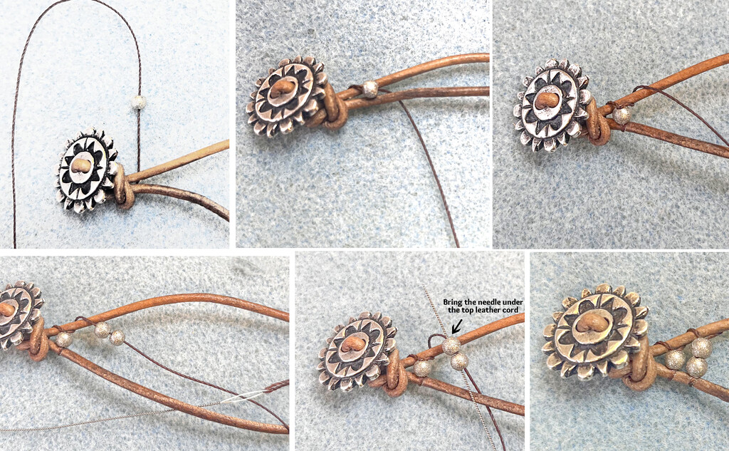 Image 1: To start, slide a stardust bead onto the Linahsita. Image 2: Bring the needle over the top cord and under the bottom cord, pull to tighten. Image 3: Now, Bring the needle up through the first bead. The needle goes behind the top leather cord, pul to tighten. Image 4: Add two more beads. Bring the needle under the bottom cord and back up through the beads. Image 5: Bring the needle under the top cord and pull tight. Every time you add beads this is the threading pattern you will do. Remember, over the top cord, under the bottom cord, and under the top, then start over. See the pattern image above to keep going.
