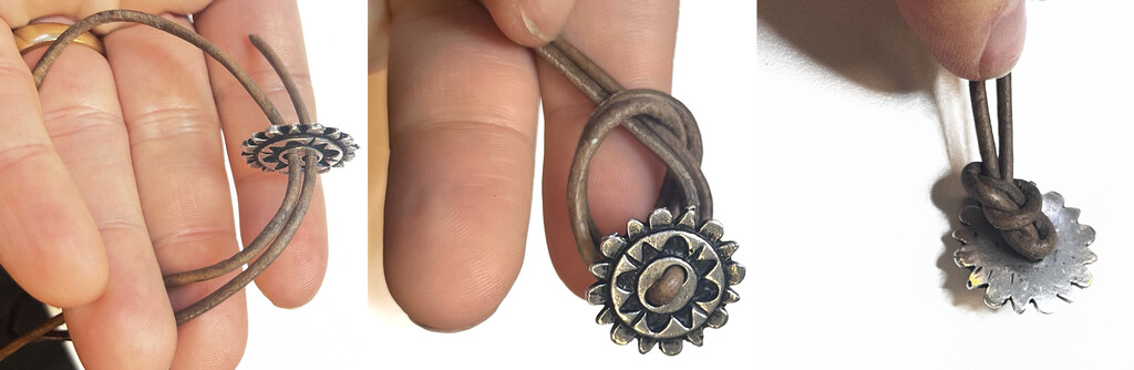 Cut the leather cord to the length you need, I cut 30". Image 1: Slide one cord end through a button hole, then take the other cord end through the other hole. Pull the button until it is in the center of the cord. Image 2 & 3: Tie a knot with the button at the base of the button.