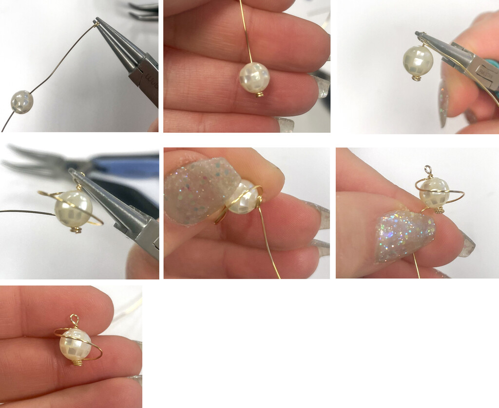 Image 1: Cut a 6" piece of wire. Use round-nose pliers to create 2-3 tight spirals at the end of the wire. Image 2: Slide the mosaic round onto the wire. Image 3: Use the round-nose pliers to create a loop at the top of the bead, then wrap the wire around the base of the loop twice. Image 4: Now, start forming the planet ring. Image 5: Wrap the wire around the coil twice at the base and trim. Gently work with the wire so the coil looks nice and neat. Images 6 & 7: Trimmed and finished piece.