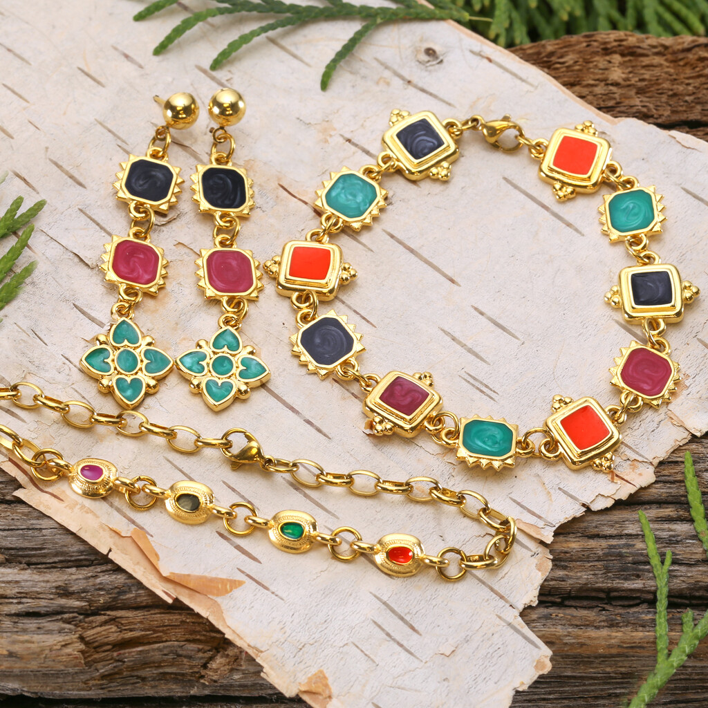 Elegant shapes with exciting pops of enamel color create this fabulous set that is perfect to wear on the daily or for an upscale evening out.
