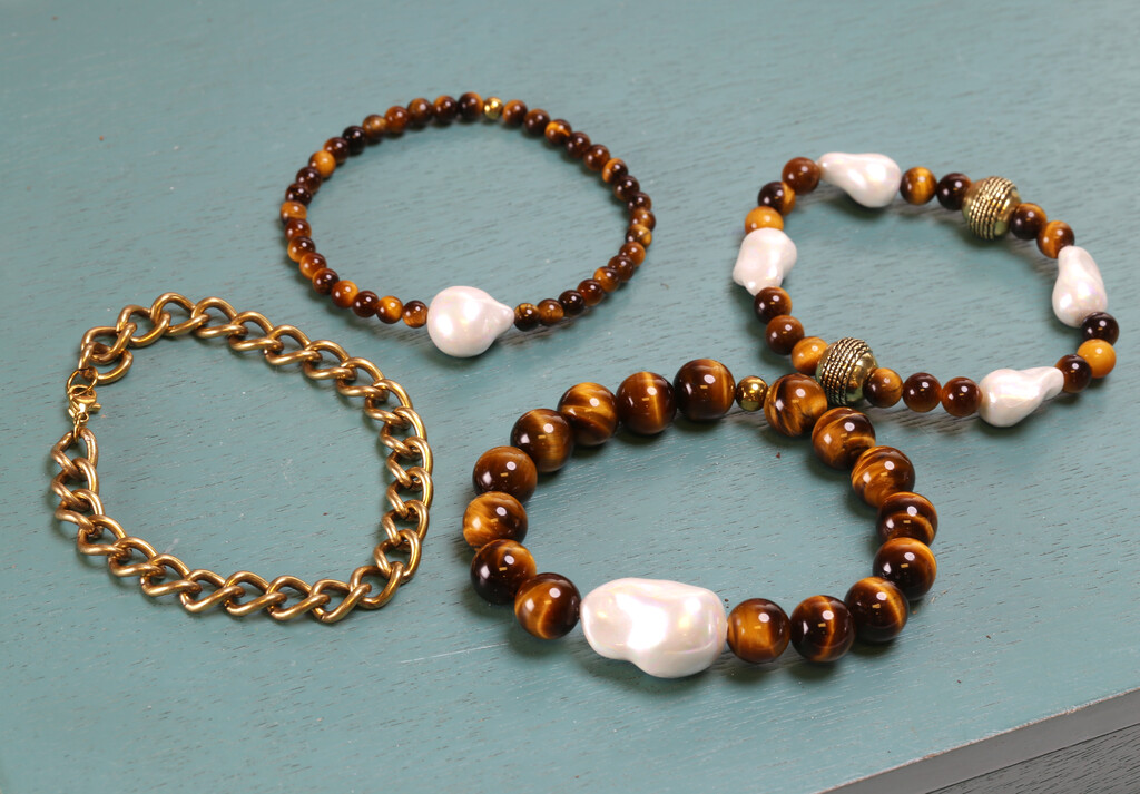 Tiger eye gemstones symbolize courage, strength and protection. The rich tones and the silky, chatoyant patterns shimmer in the light. Baroque shell pearls add a chic beach vibe to this stack.