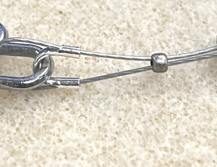 Cut 25" of strand wire. Slide the beads on in the order shown. The pattern is four apatite beads and one seed bead.