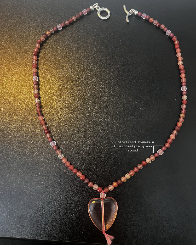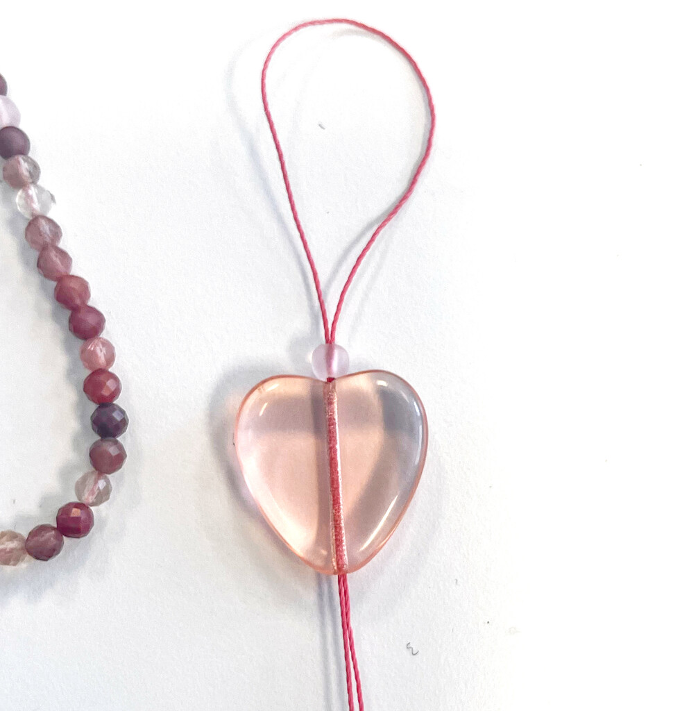 Cut an 8-inch piece of Linhasita cord. Fold the cord in half. Feed both tails down through a beach glass round and the heart.