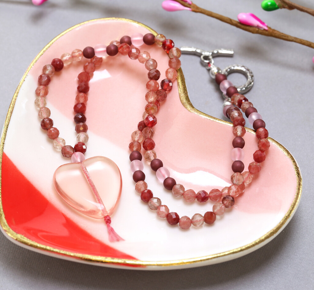 This soft pink heart necklace is simply styled for effortless wear every day of the week. The rose pink Linhasita cord enhances the pink beads in the necklace.