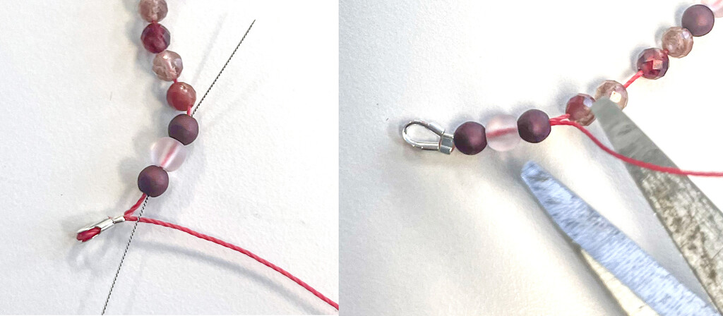 Use your fingers or pliers to push the wire protector end in. Use crimping pliers to crimp the crimp tube. Image 1: Thread the cord tail onto the needle. Thread the cord through 2-3 beads. Image 2: Trim the cord.