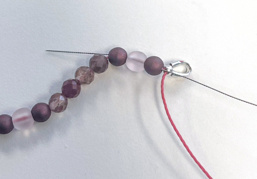 Cut 26" of Linhasita cord. My necklace is about 17.5" long when finished, including the clasp. String the beads on in the order shown.