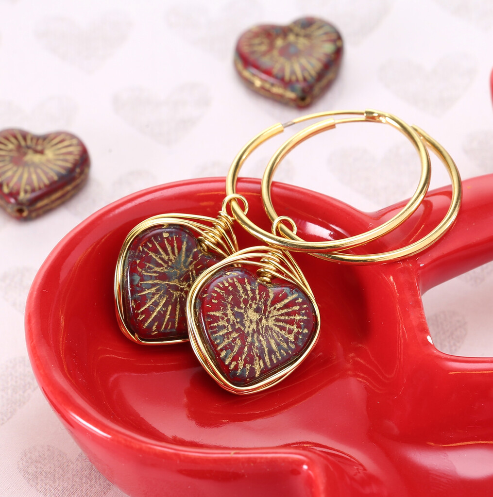 Red hearts are wire-wrapped with a herringbone pattern, giving a modern edge to this earring design.