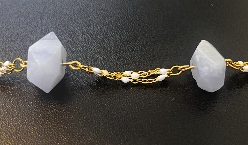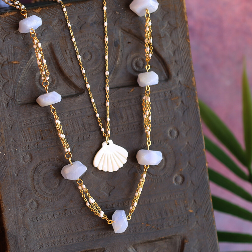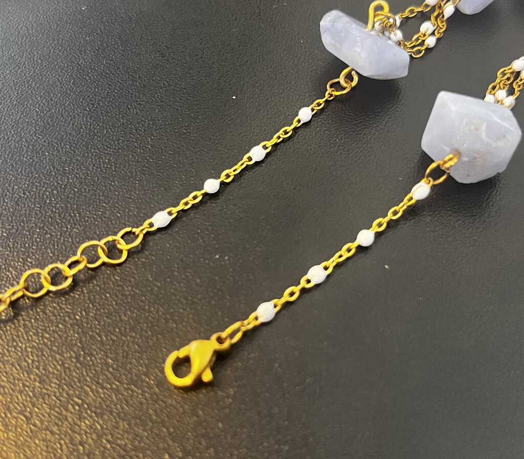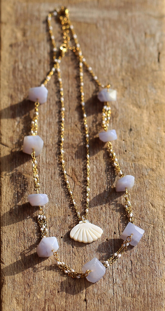 Blue chalcedony nuggets shine in this modern beach-style necklace set. The blue chalcedony necklace is 18" long, and the shell necklace is 16" long. You can order extra chain if you want a longer version.