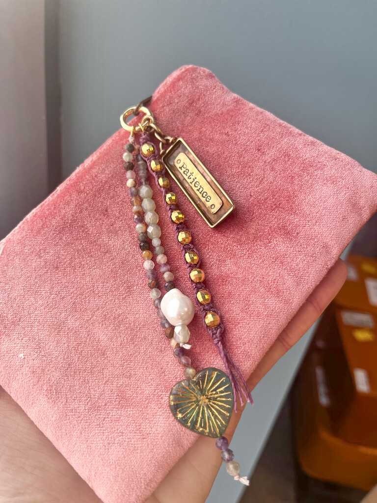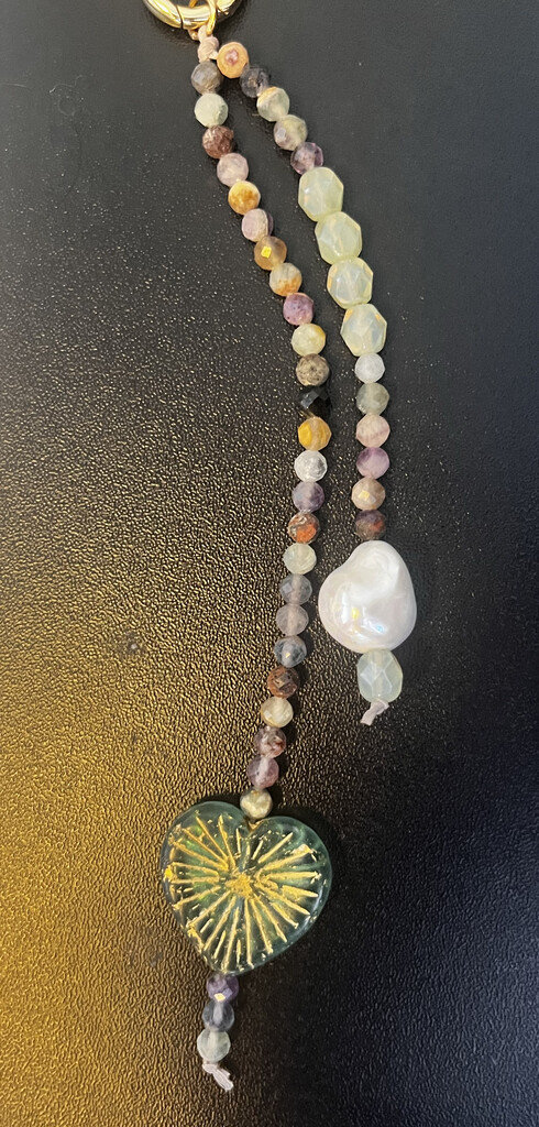 For the heart and pearl strand. Cut 13" of .35mm cord. Slide a soldered jump ring to the middle of the cord. Take both cord tails and tie a knot. String the beads on in the order shown. Tie a knot at the end. Trim any excess cord.