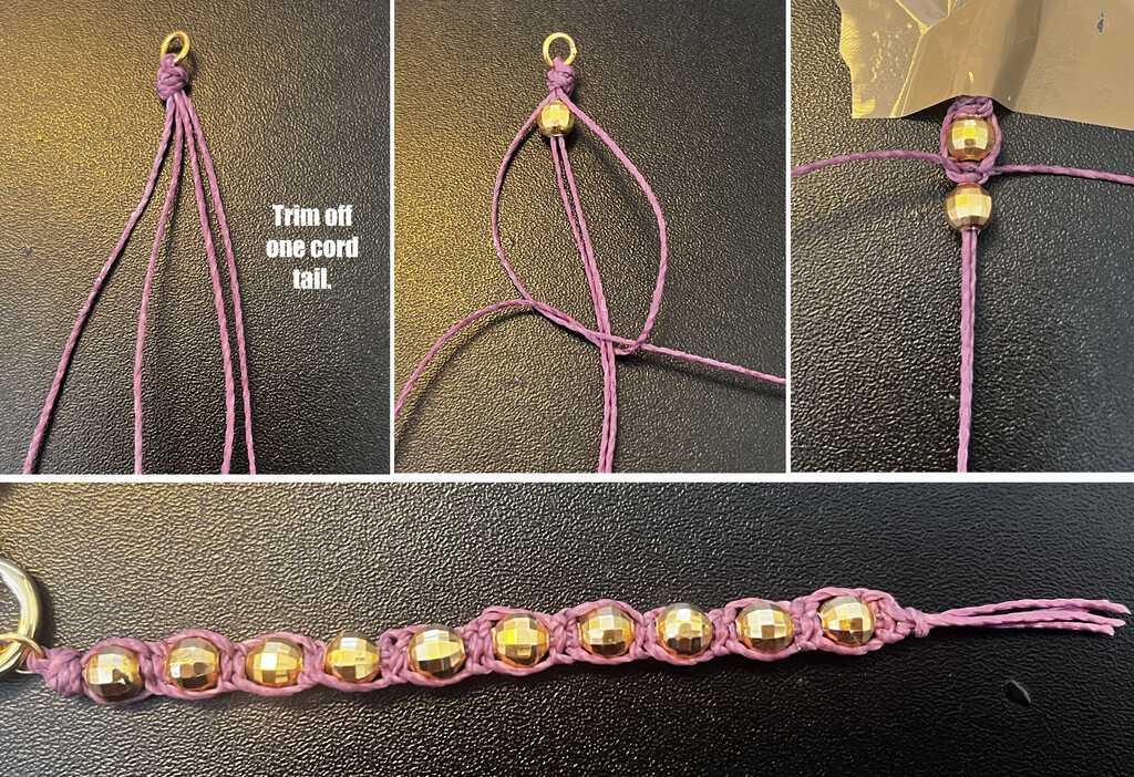For the square knot and faceted gold strand, cut 2 pieces of 20" of 1mm cord. Slide a soldered jump ring onto the center of both cords. Create a knot with all cords. Trim off one cord tail. Tape down the end to hold the cord tight. Slide on a gold faceted round, create two square knots in between each gold round. I used 10 gold rounds. Tie a knot at the end, trim the cord.