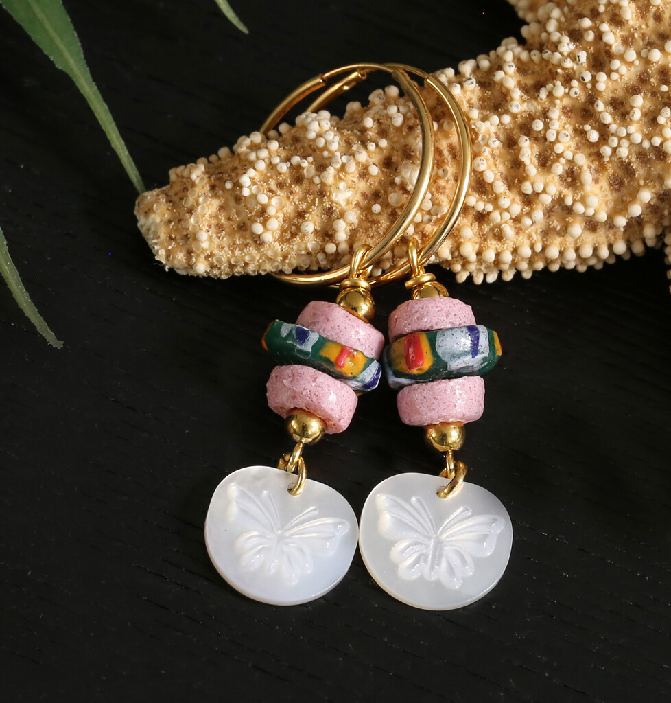 These earrings are the epitome of spring. Fluttering butterflies dangle from colorful African glass beads. Butterflies symbolize transformation, freedom, and rebirth.