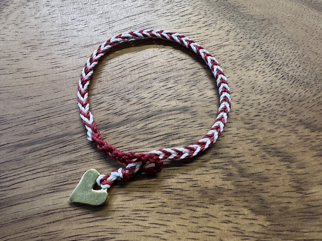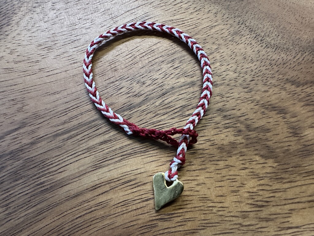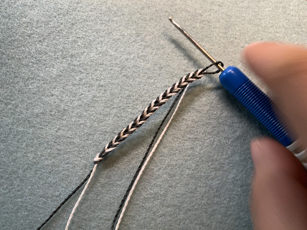 Continue in this manner, always alternating colors, to achieve a nice striped chevron cord. When you’re finished, you can pull both colors through the final loop, and finish your cord as you like. If you make a mistake, it’s easy to simply pull the chains out until you remove the mistake, and resume.