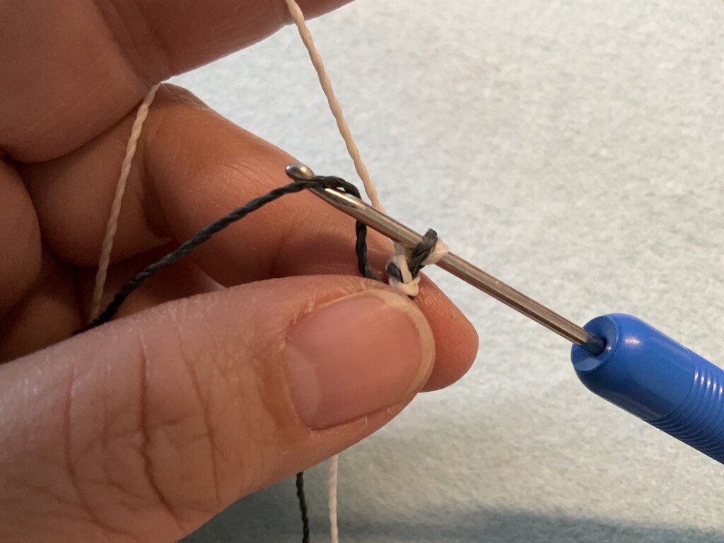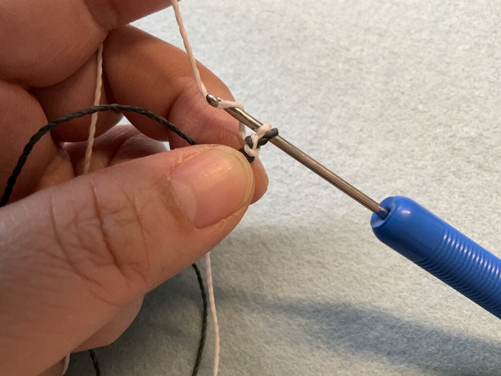 Insert your crochet hook and pull the slip knot snug but just a little loose around the hook. Note which color cord is closest to the hand holding the hook. Here it is Cord B.
