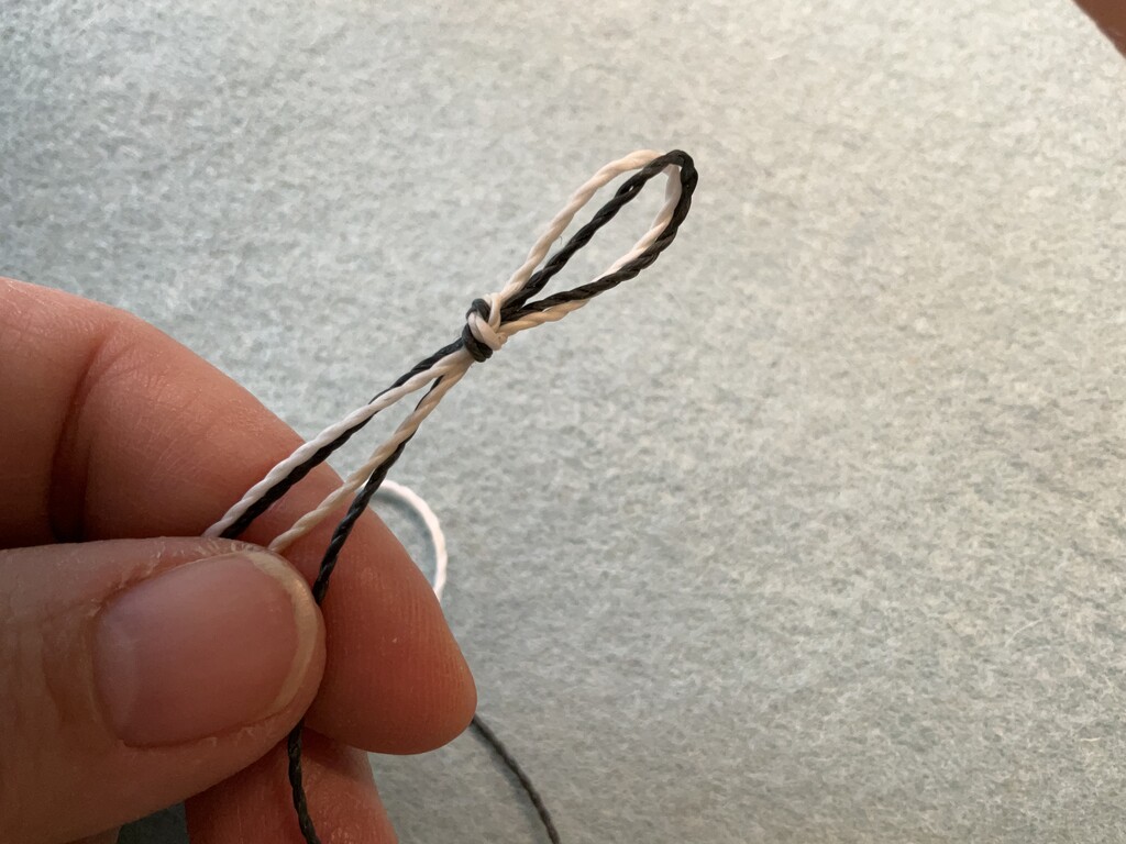 Choose your two colors in the same thickness. I used Linhasita 1mm cords in contrasting colors, so that the chevron will ‘pop’. For this tutorial, I’ll refer to them as cords W (white) and B (black).